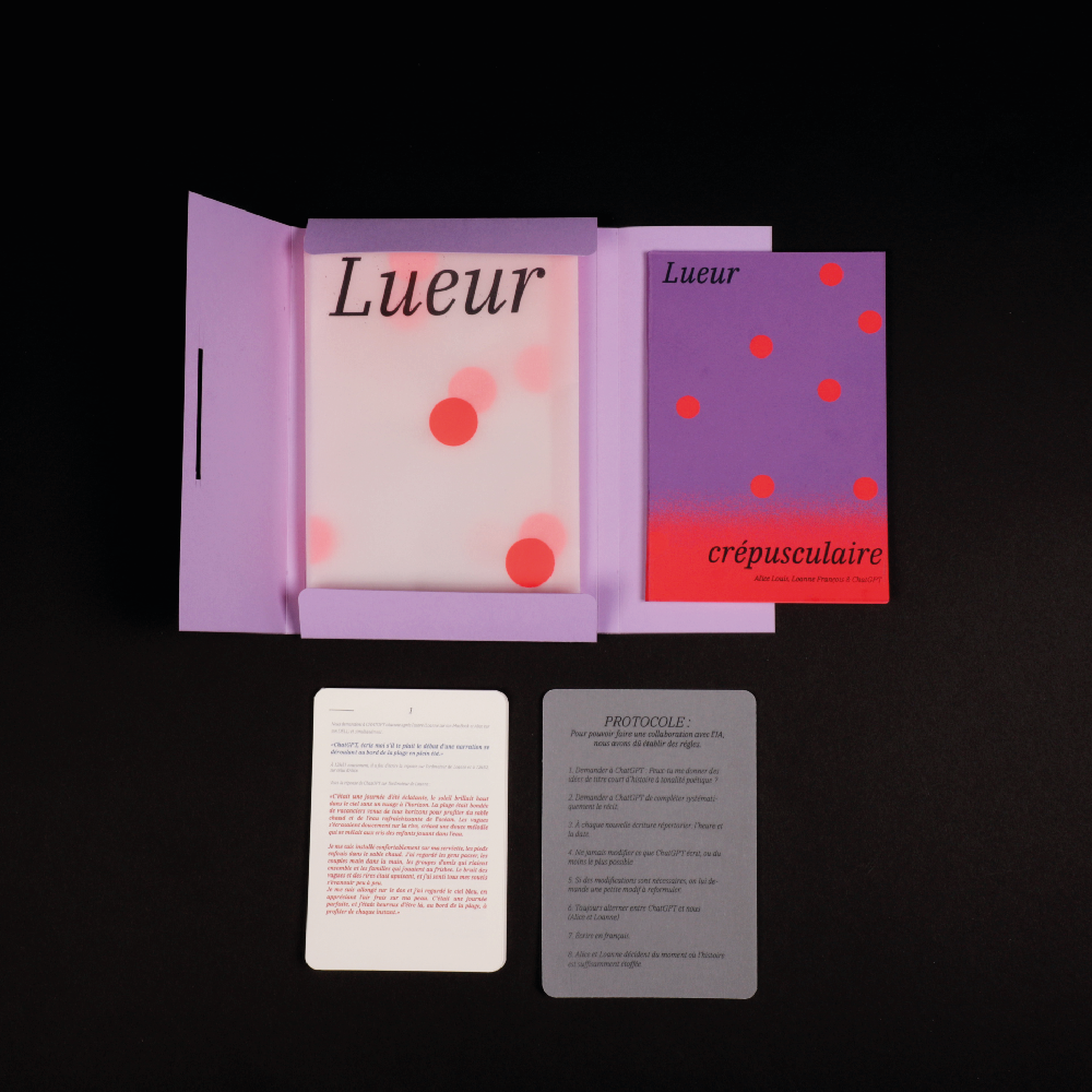 How do you work or collaborate with an AI? Loanne and I created a project with an entirely written narrative using Chat GPT. The AI becomes a collaborator, a generator of ideas, concepts and novelties. This writing also showed the weaknesses of an AI, from its easy, smooth and sometimes too neutral narration, to the fact that it can make mistakes.